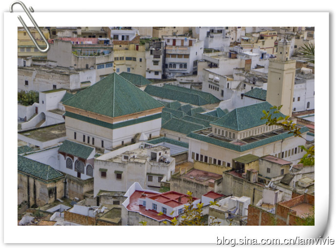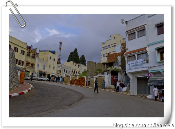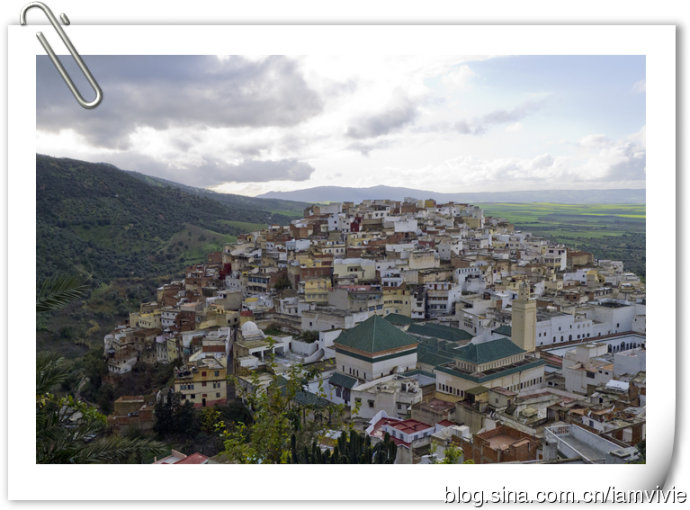 终于到了个路口看见一群聚集的grand taxi出租车,乱七八糟的人群,问了一下是不是去圣城的。问了一下价钱,竟然和LP上写的一样,10迪拉姆,坐上车等着凑够了六个人司机就开车了。话说后面坐四个人真是要挤扁了啊,加上外面下雨没办法开窗户,车里一股子怪味道,还好也就半小时不到,忍忍就过去了。