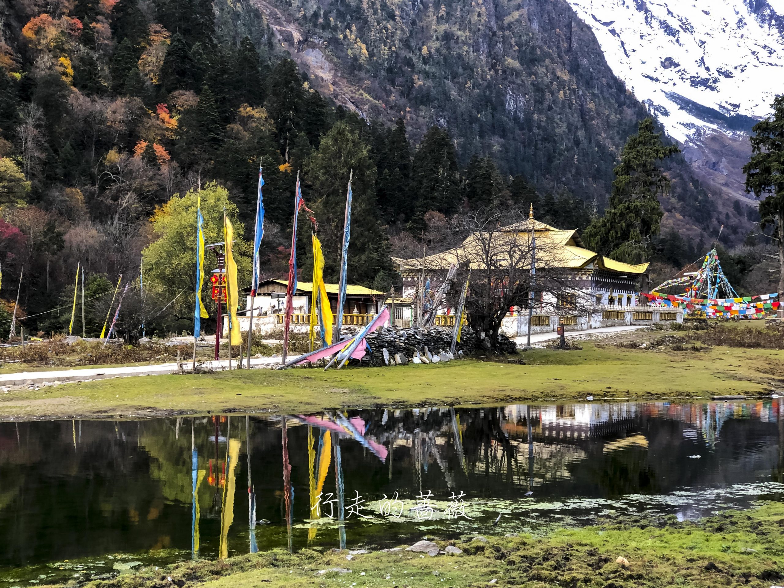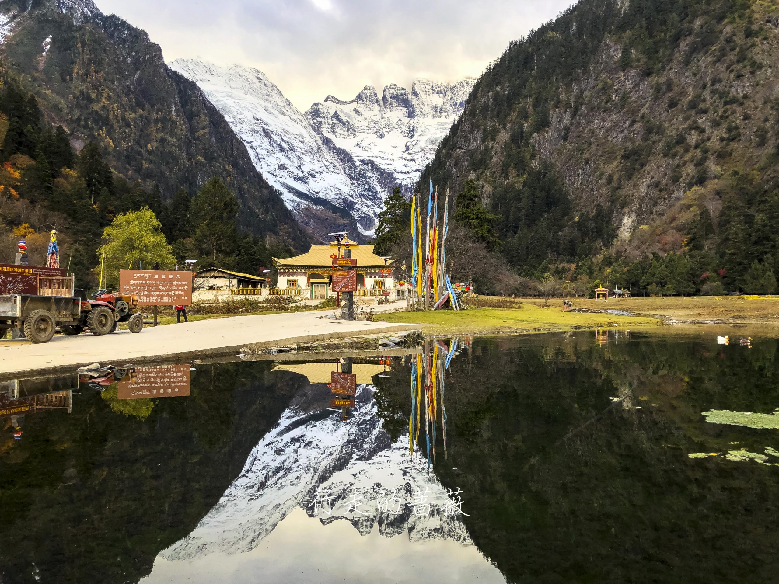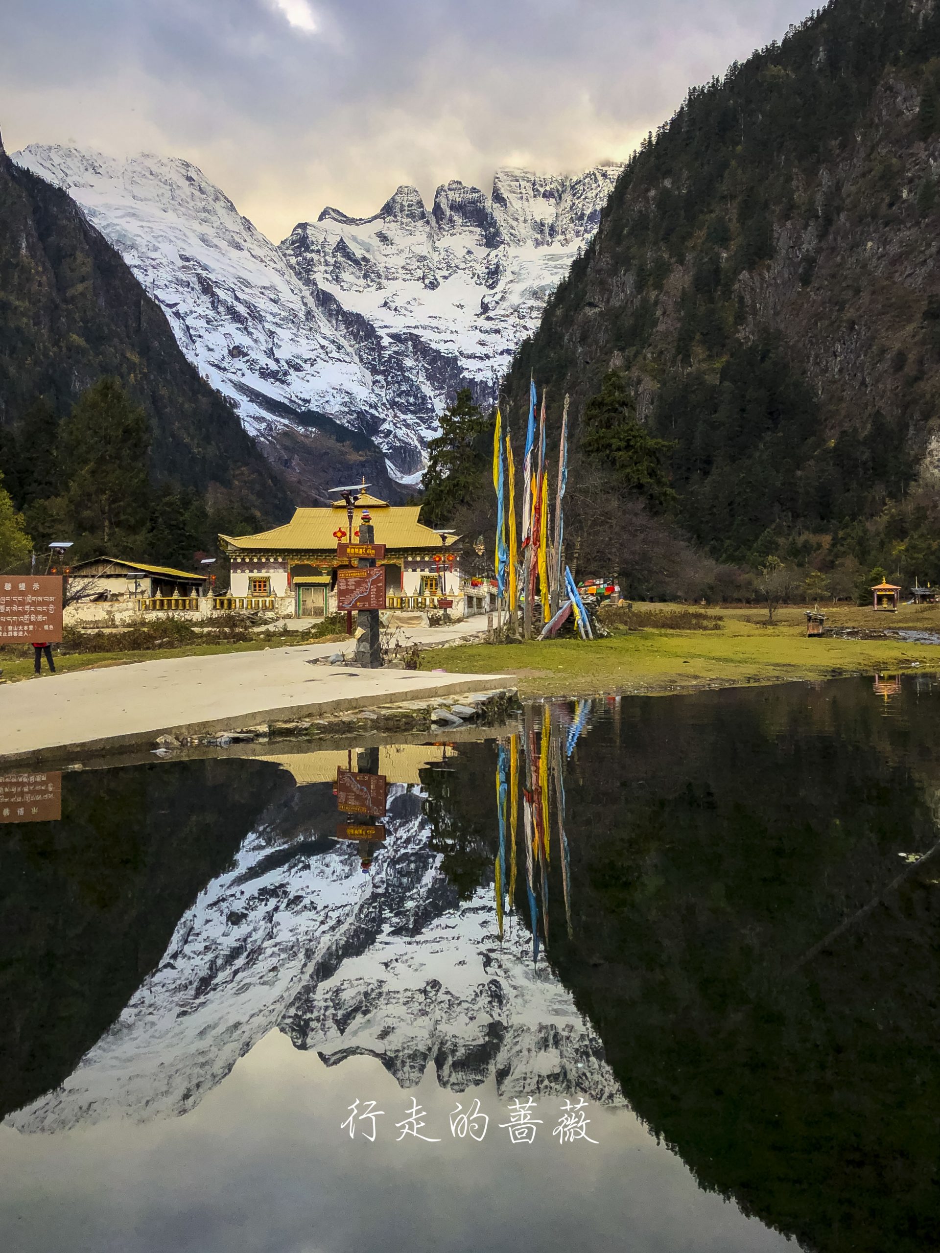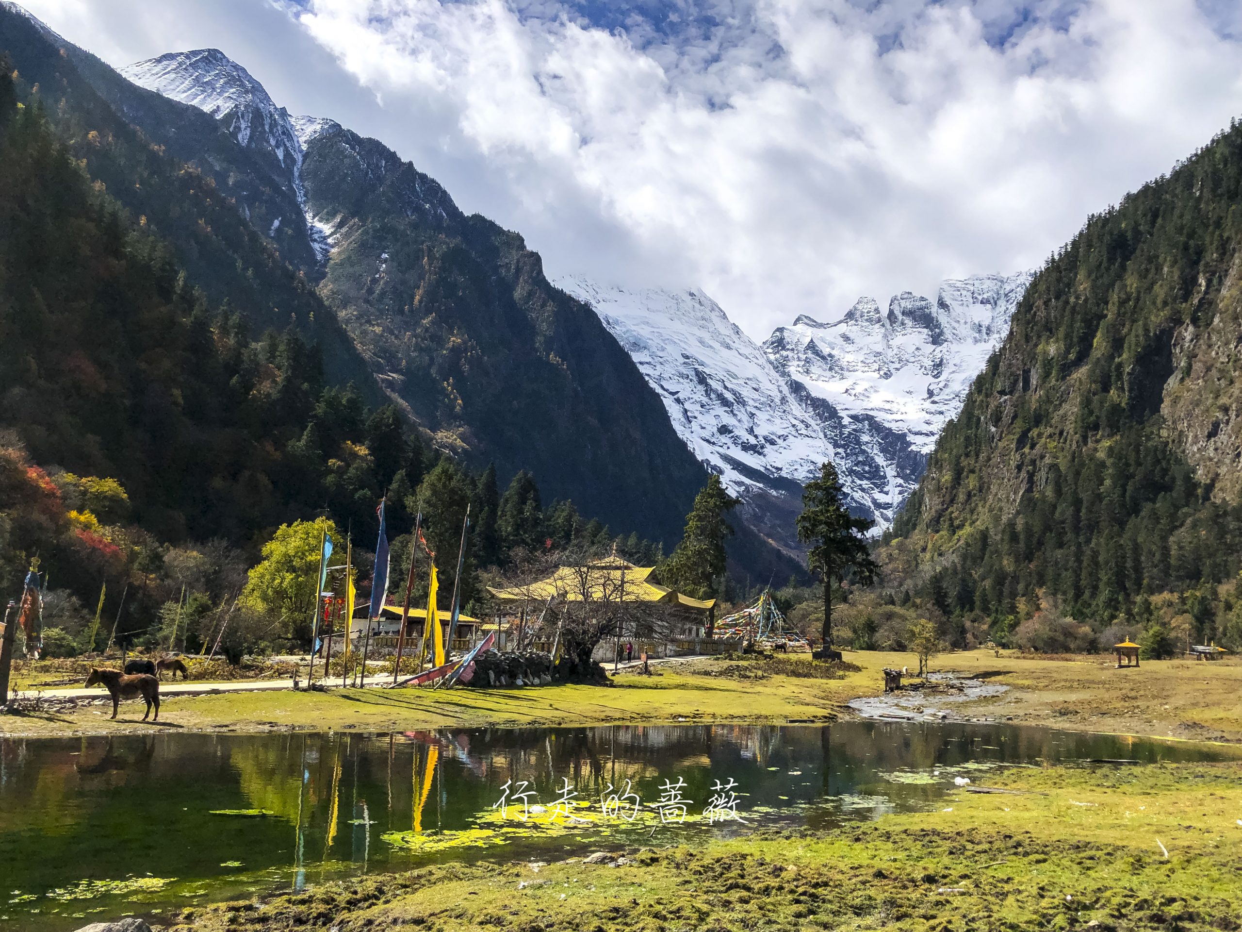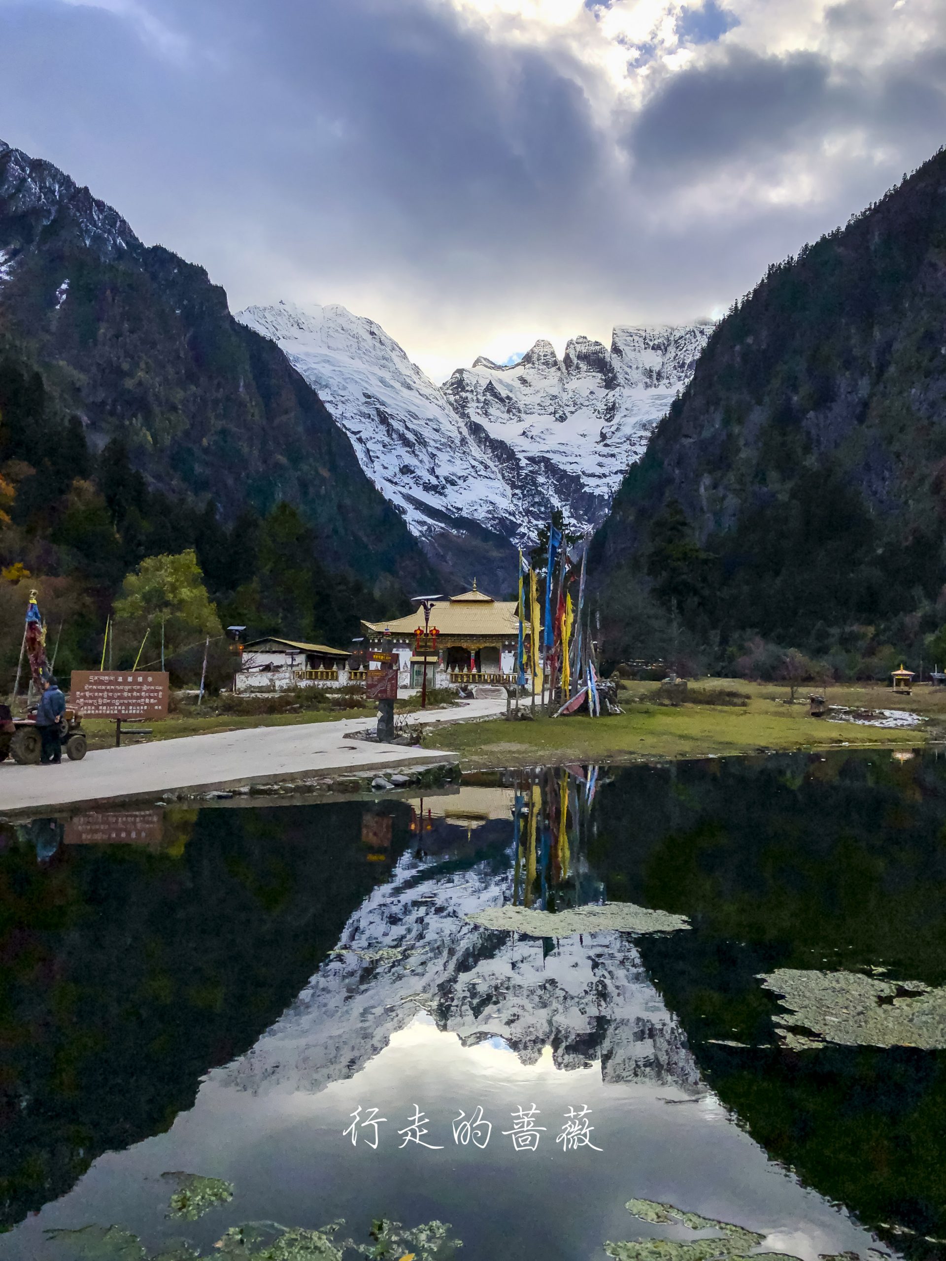 下雨崩经典的拍照角度,可以看到神女峰和五冠峰还有倒影。神女峰刚才在上雨崩还能看到顶呢,很快就被云盖住了。很多人都误会了,其实上/下雨崩村都是看不到最高峰卡瓦格博的,可以看到的是神女峰、五冠峰、将军峰。