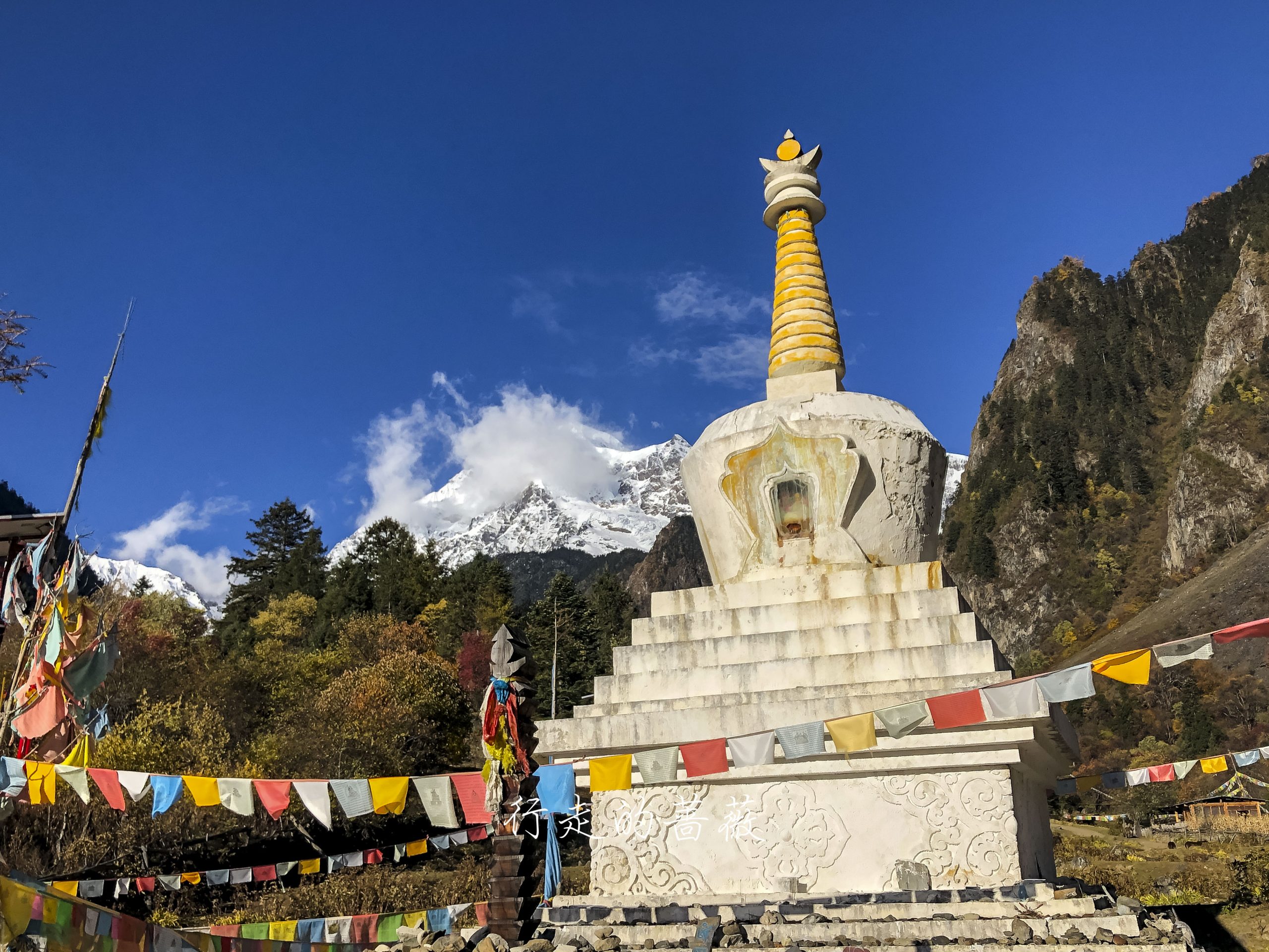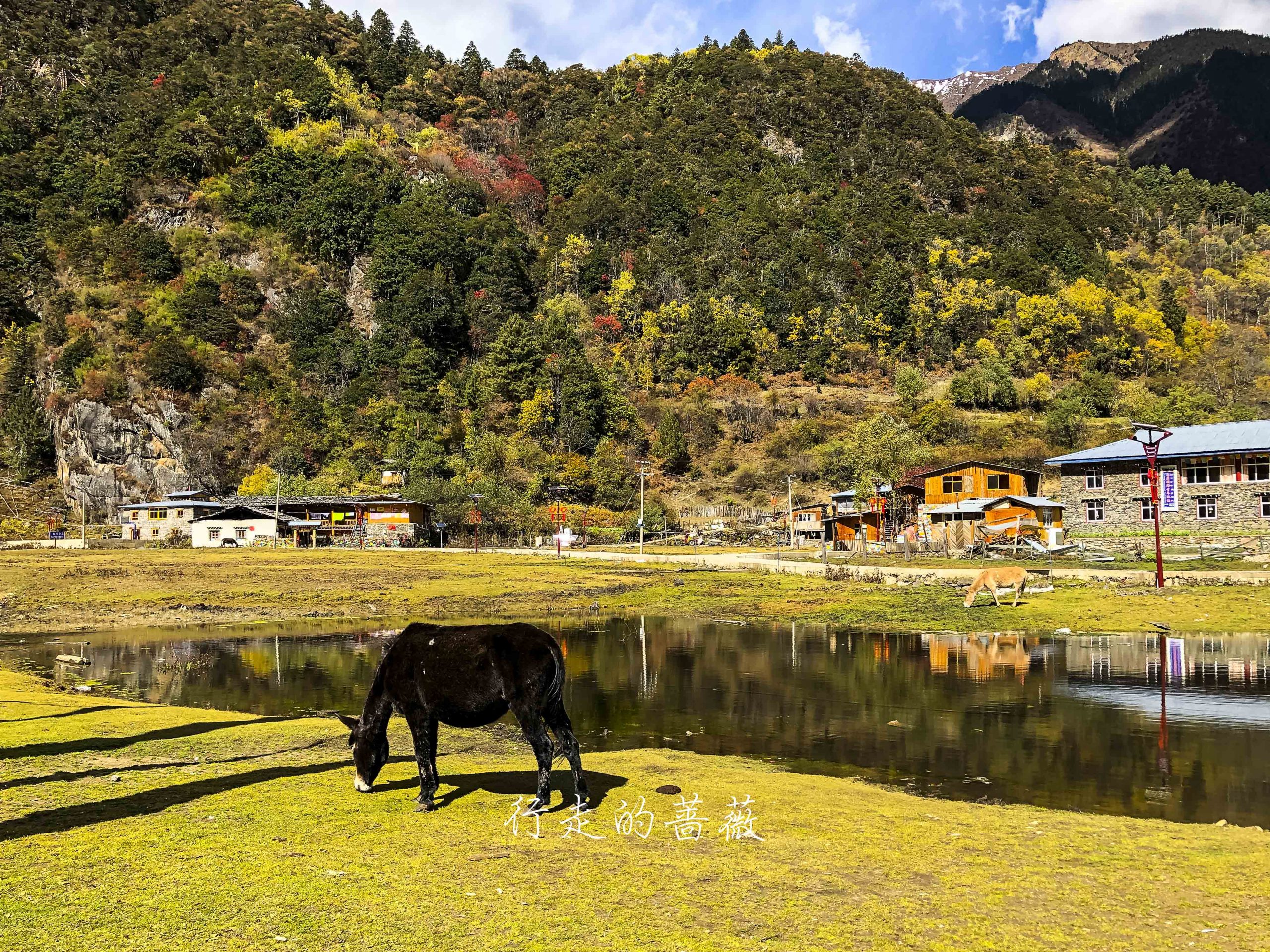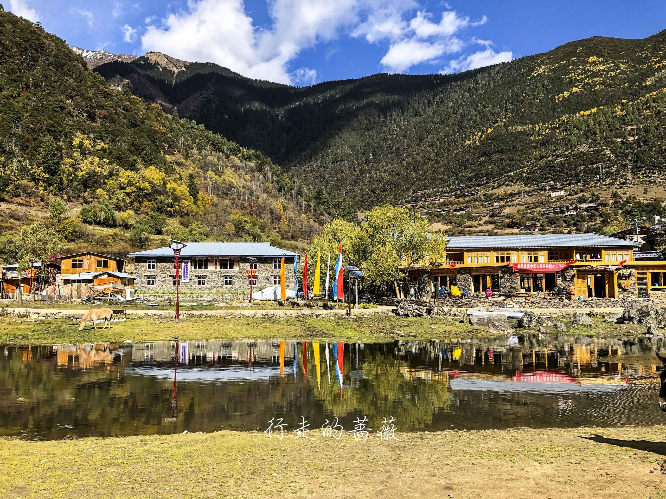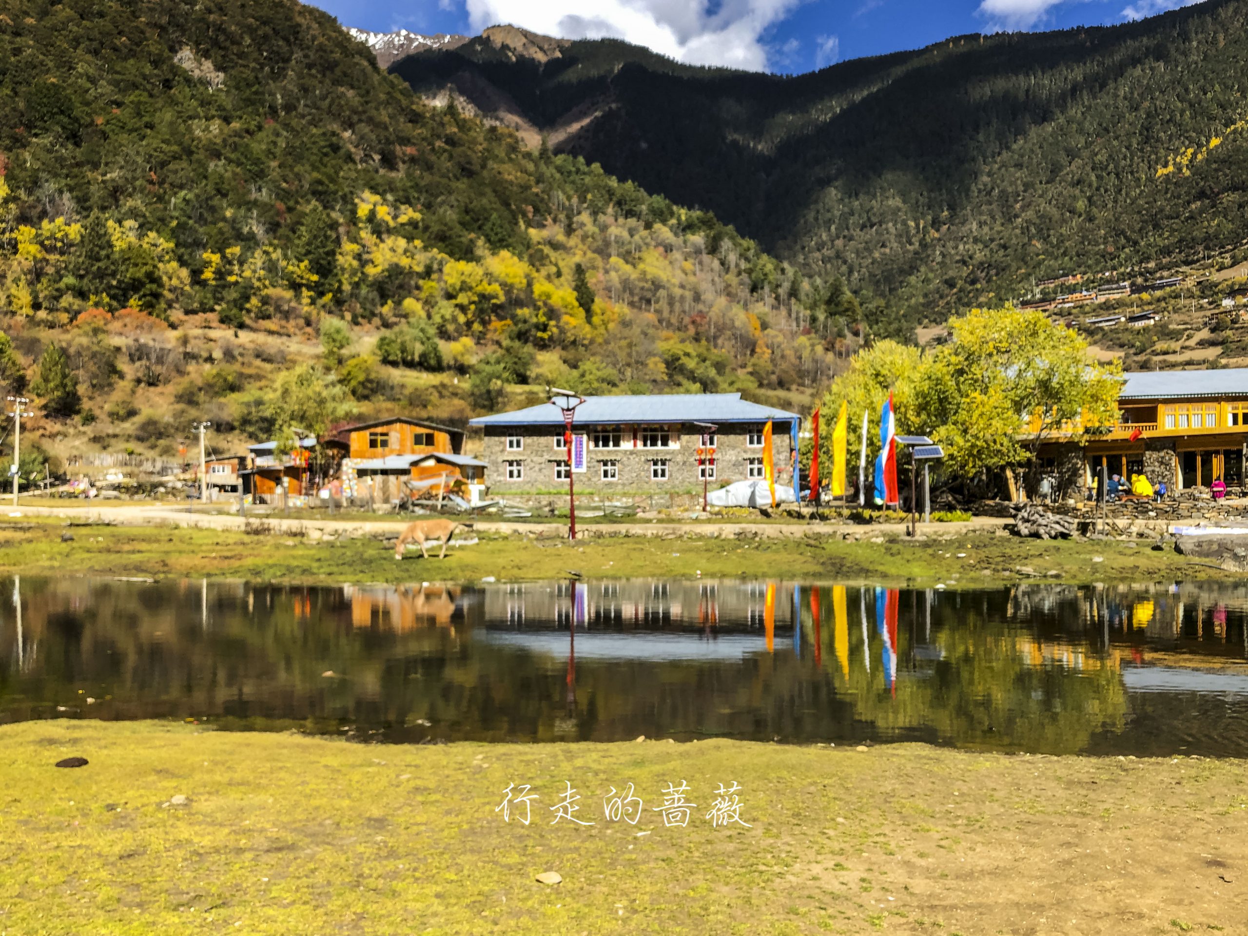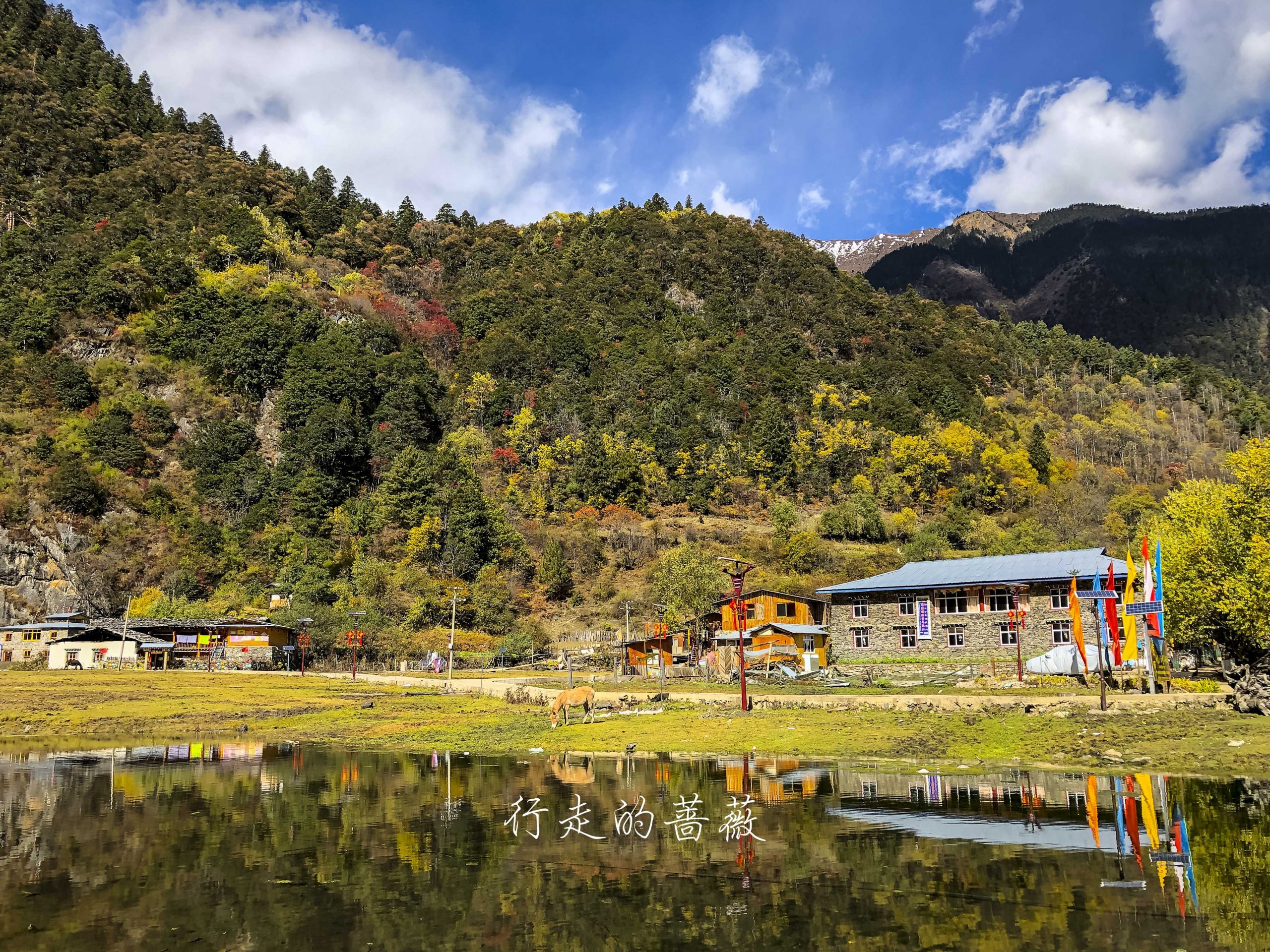 下雨崩经典的拍照角度,可以看到神女峰和五冠峰还有倒影。神女峰刚才在上雨崩还能看到顶呢,很快就被云盖住了。很多人都误会了,其实上/下雨崩村都是看不到最高峰卡瓦格博的,可以看到的是神女峰、五冠峰、将军峰。