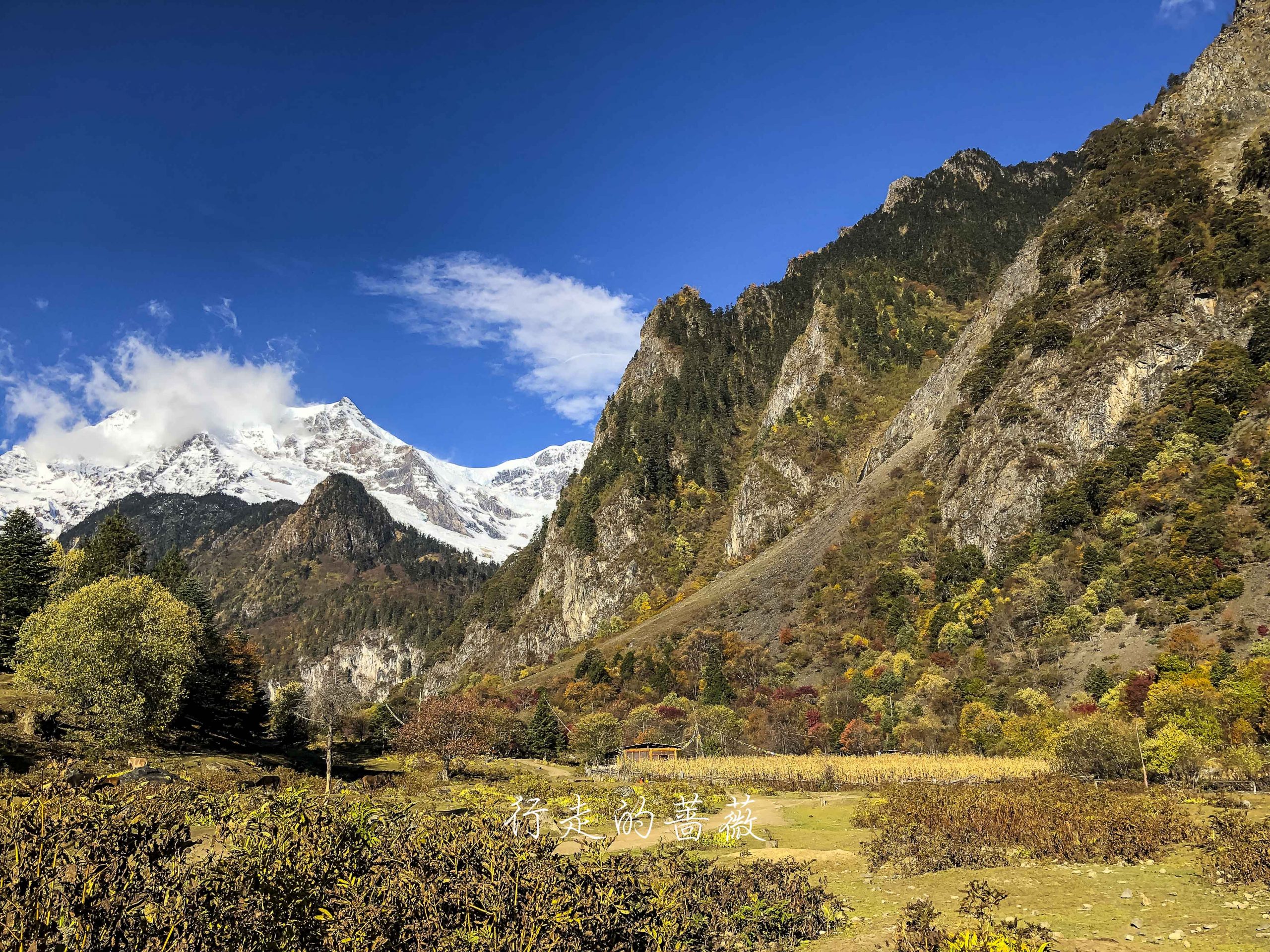 上雨崩到下雨崩其实很近,而且基本都是下坡,不费什么力气。半山腰的风景很好,可以俯瞰这个大山深处的下雨崩村。感觉上雨崩在山腰上,有点拥挤,下雨崩在山谷中,视野也很开阔。上雨崩和下雨崩是通车的,我们看之后有些向导带团坐车的,因为不然从下雨崩到上雨崩还是要爬一阵的。但是好像应该不是我们走的这条路,我们这条很破。