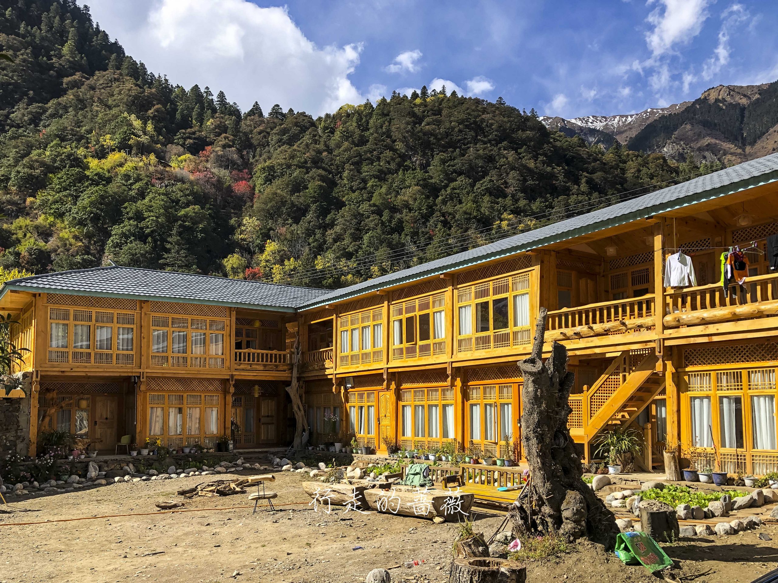 这个房子是据酥油茶老板说是全雨崩最好的客栈,唯一有地暖的,叫做格桑什么的,就在下雨崩村口,位置很好。之前台湾大姐好像也提过,说态度很差,我们也问了大概好像最便宜四百多一晚,态度确实不咋地。我挑了一家是在这个斜对面的雨崩假日客栈,标间才150一晚,有电视有热水,还可以免费藏药泡脚。还有人专门来问想泡脚,老板说只是为住的客人提供的,不对外出售。我们办理完入住后,就搬了椅子在院子里继续晒太阳。