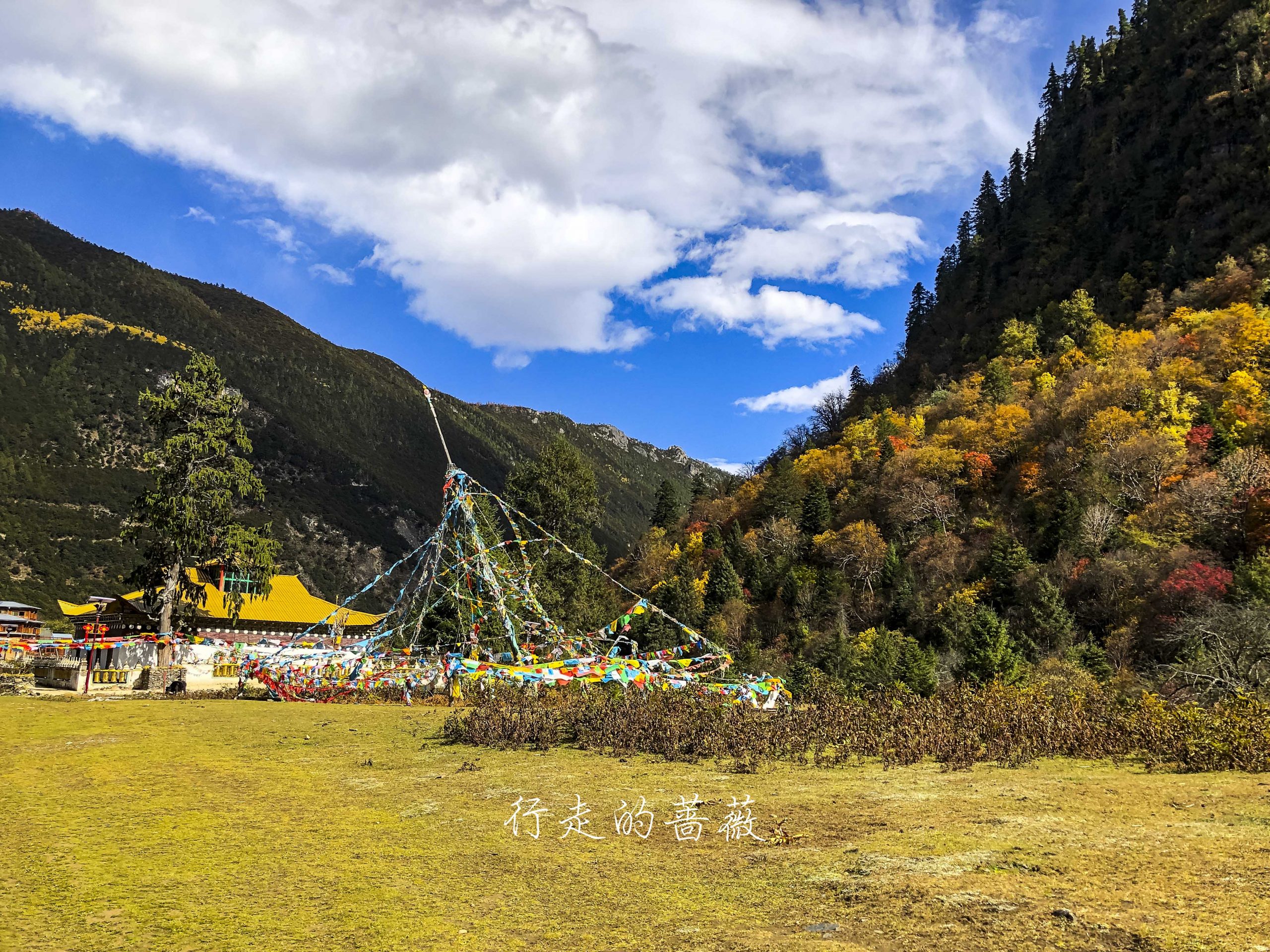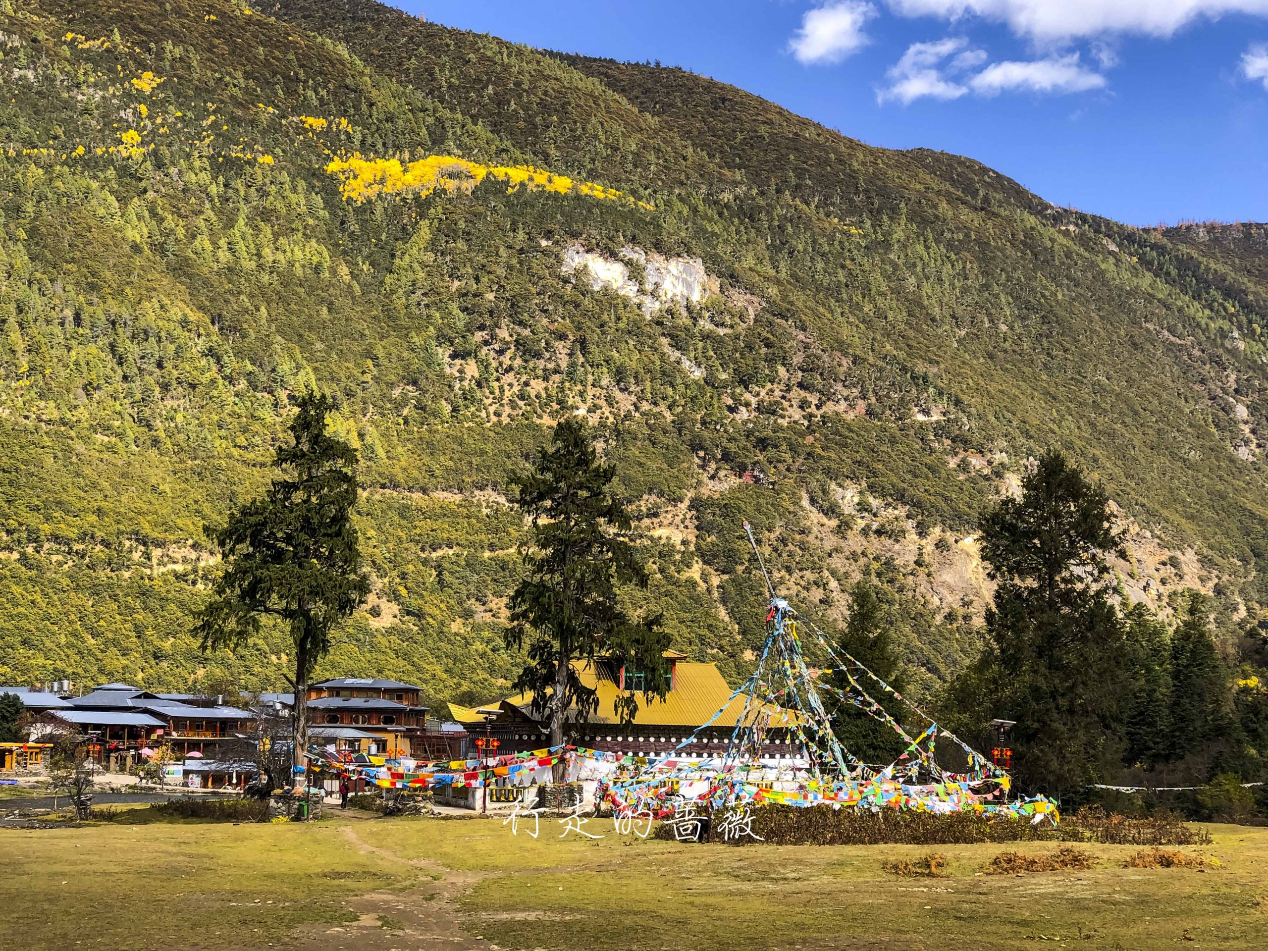雪山下的寺庙也格外有意境,但寺庙是关门的,不知道是不是只有藏民能进。阳光正好,坐在草坪上吃点东西晒晒太阳,也太惬意了。