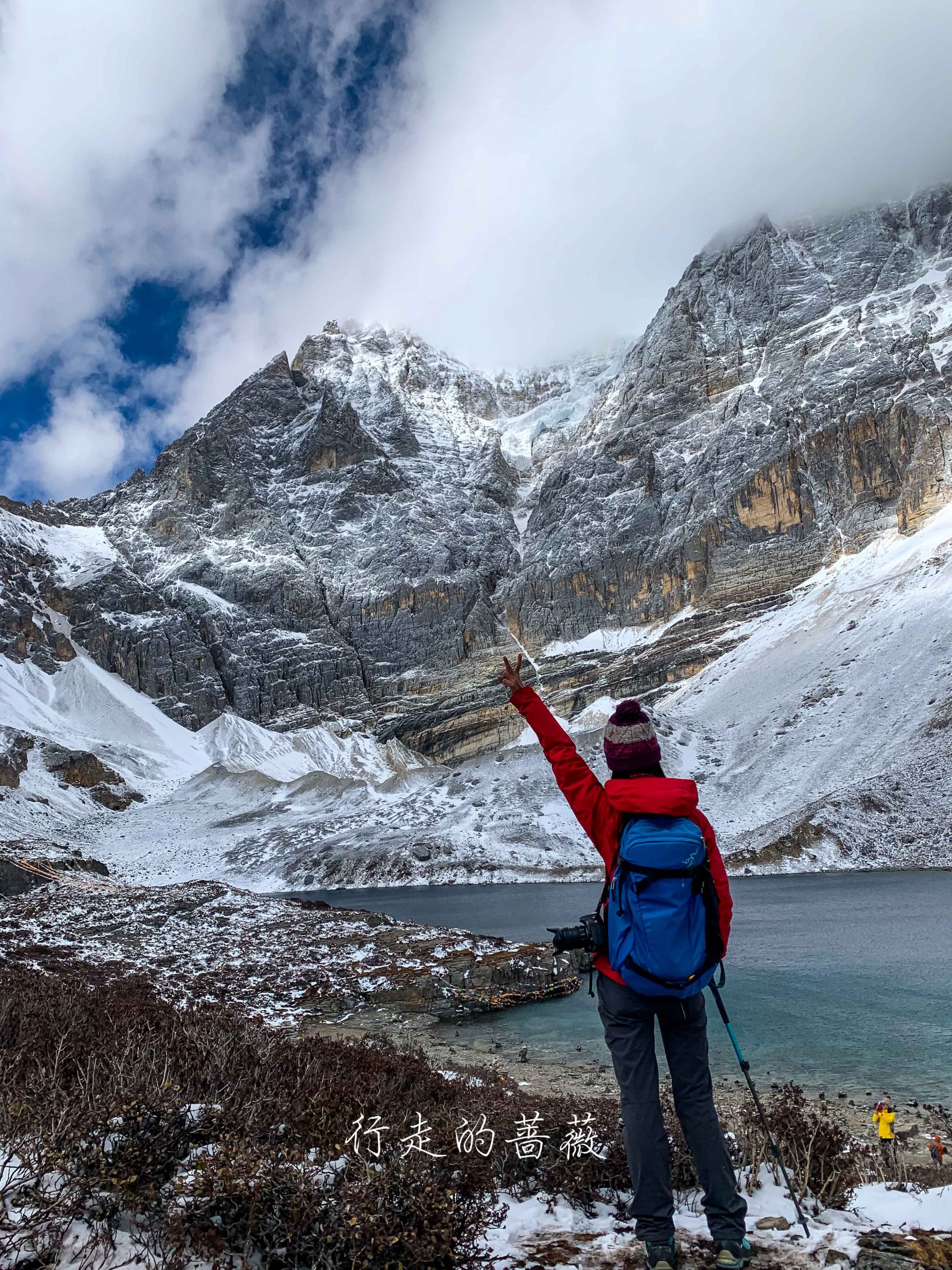 我们开始往牛奶海方向走,虽然不是爬大坡,但是漫长到怀疑人生,总是看不到目标牛奶海出现,走啊走啊,看到很多人,就知道牛奶海到了!牛奶海四周雪山环绕,以其玲珑秀雅水色翠蓝而得名,传说是能治愈聋哑怪病的圣湖。因为山上云雾缭绕,光线不好,所以景色有点一般。但这都不是问题,主要的问题是,人好多!风好大!天气好冷!我和细细这么懒的人,绝对是保命重要,随便拍了拍,赶紧撤退。有个路人让我帮她拍照,还说我要三张,一张要酱酱紫,一张要那样那样,一张山怎么样水怎么样,我一听第一念头就想把她手机扔回去。我就给她拍了一张,赶紧把手机塞回给她,拜托,我们俩连自己都冷到懒得拍,我还给你费劲巴拉的拍照呢。不得不佩服能坚持为了拍照和拍视频坚持在寒风中的人们,是像我这种意志薄弱的完全没办法达到的境界。